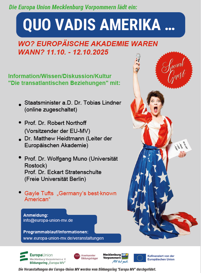Wir laden Sie herzlichst zu einer ganz besonderen Veranstaltung in unserem Hause ein. Am Mittwoch den 29.10.2025 von 11:00 - 15:00 Uhr wollen wir gemeinsam 35 Jahre Deutsche Einheit und 35 Jahre der Europäischen Akademie M-V feiern. Hierzu erwarten wir interessante Gäste aus der Gesellschaft, aus Vereinen und Verbänden, aus der Politik, sowie aus dem öffentlichen Leben. Bei Erfrischungen und musikalischer Untermalung wollen wir gemeinsam diskutieren, wo Deutschland nach 35 Jahren Wiedervereinigung steht und wo die Reise hingehen könnte. Darüber hinaus möchten wir auch die Historie und das Fortbestehen der EA M-V als unabhängigen Bildungsträger in den Fokus rücken